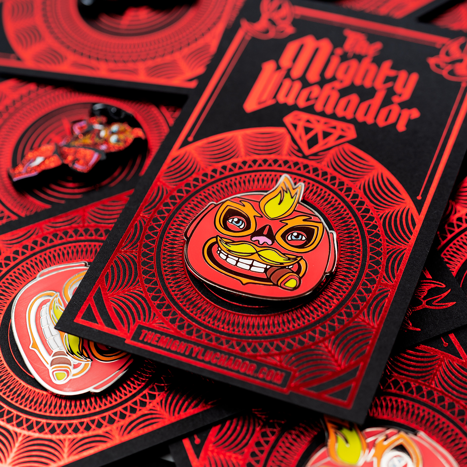 Limited edition 1.5″ Señor Fuego enamel lapel pin head in signature Fuego hues. You can’t beat that smiling Fuego with his trademark cigar, ready for his next fight with a grin bound to brighten any day! Wear it on clothes, outerwear, or your gym bag to show the world you’re as fiery as Fuego!